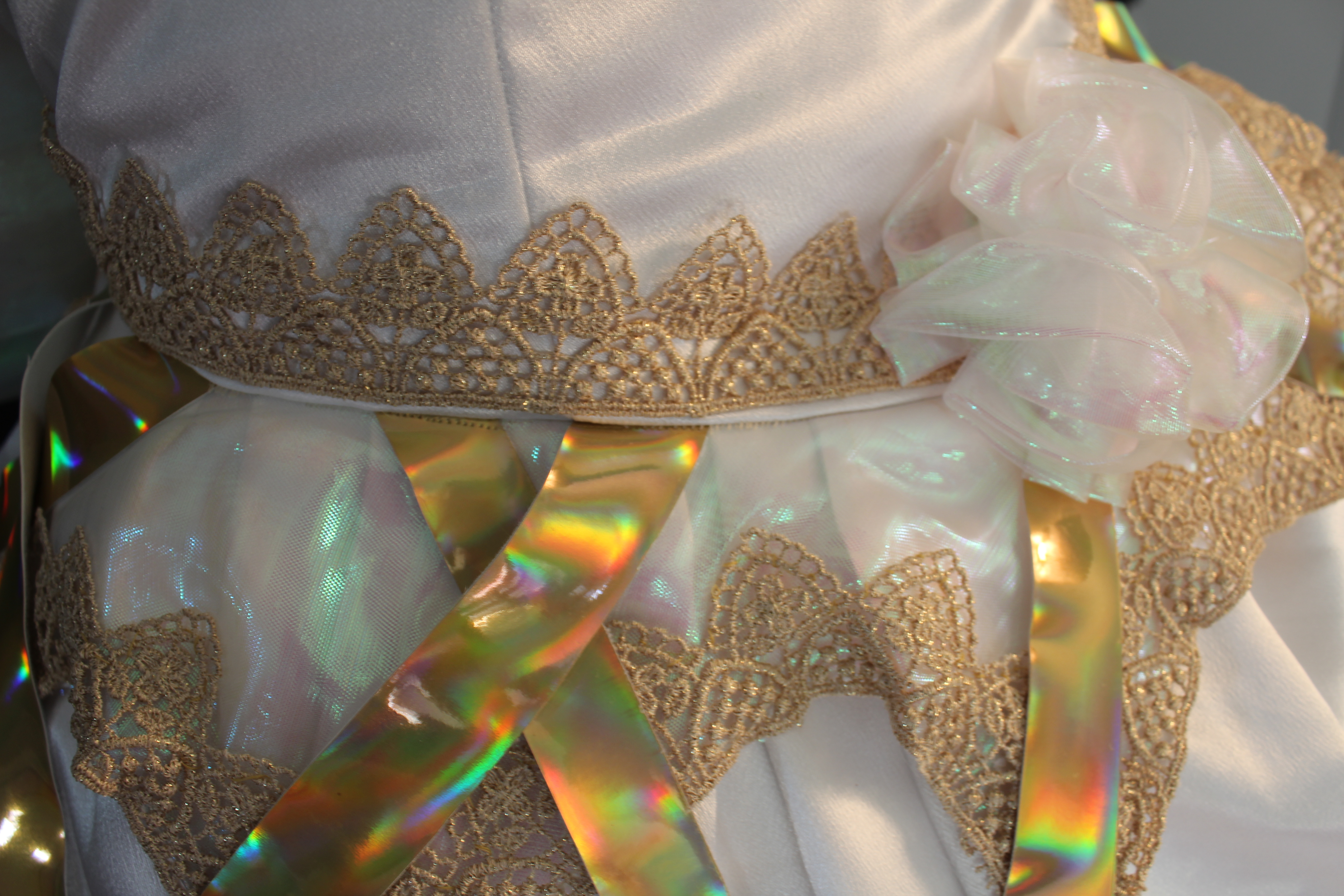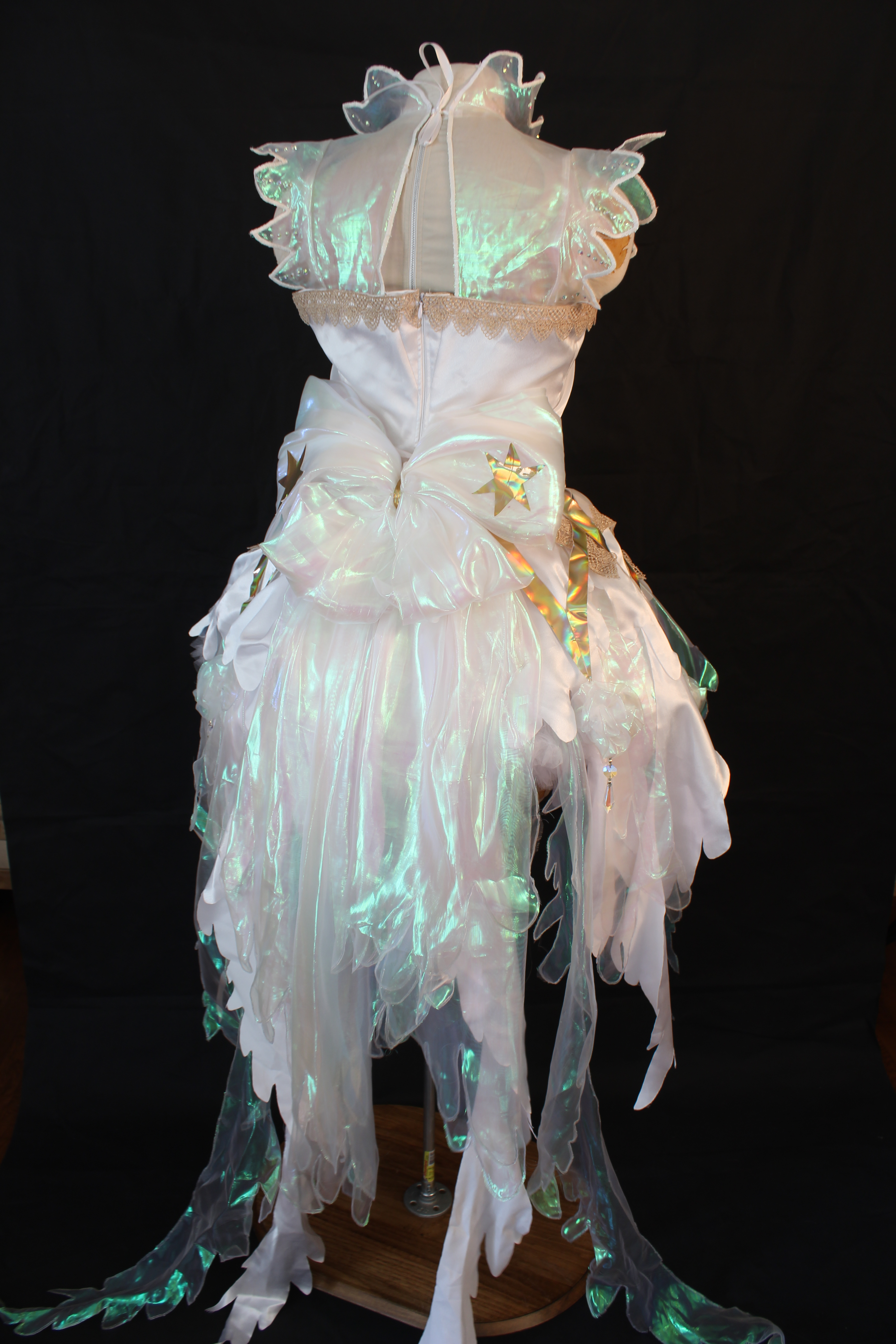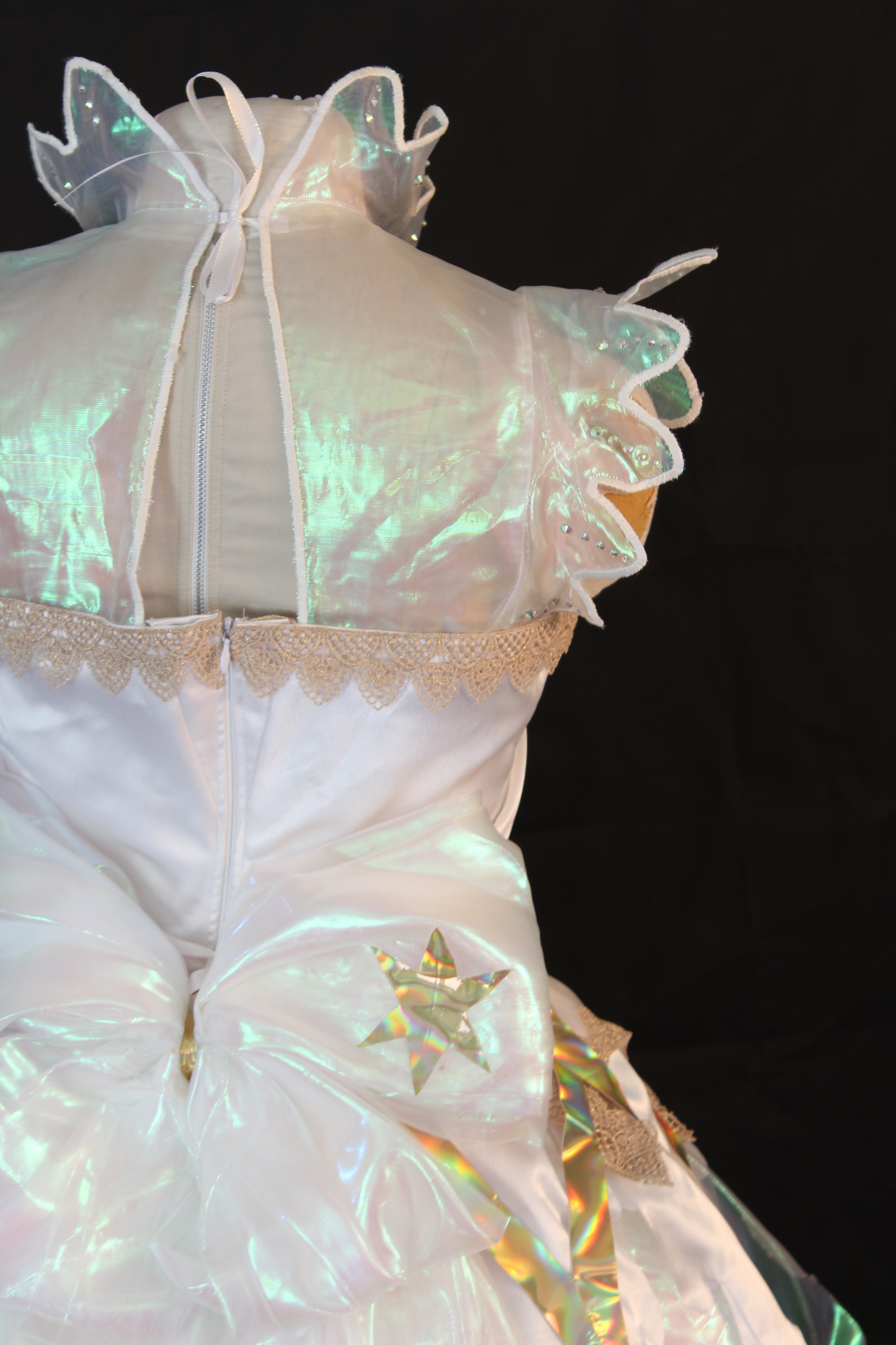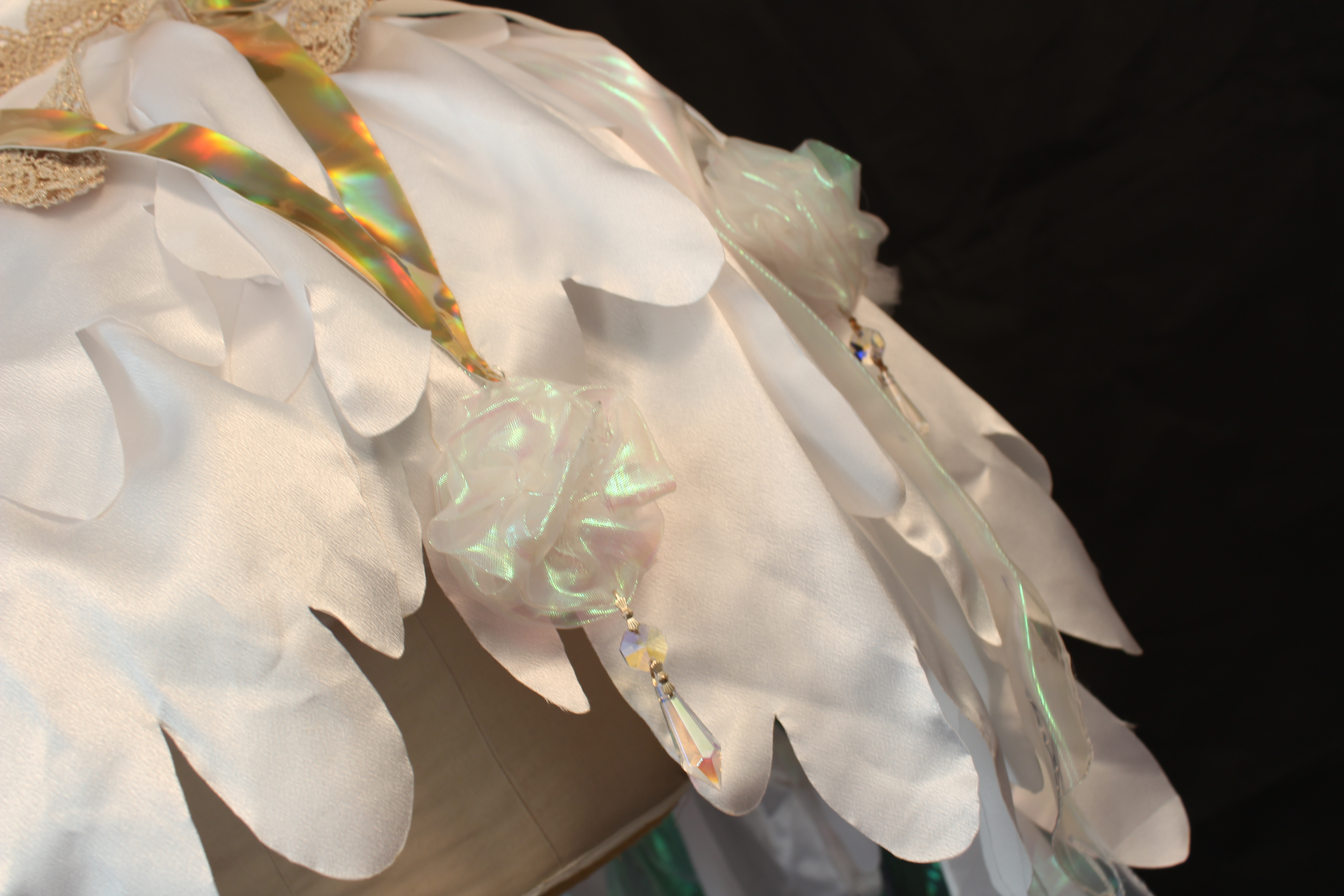 Dress made with satin and organza bodice. Skirt layers cut into a feather like pattern: edges burned to avoid hemming. Features two overlays: one of pointed holographic vinyl, each point leading to a pom pom and crystal, and the second a pointed scallop of organza, trimmed with lace. Open sleeves and collar are cut into a petal shape with the addition of rhinestones to each petal. Gloves and shoes mirror the petal design. Rear hidden zipper as well as ribbon to close collar. Crystals sewn to chest along with lace and pom poms made of organza. Rear attachment of a large bow