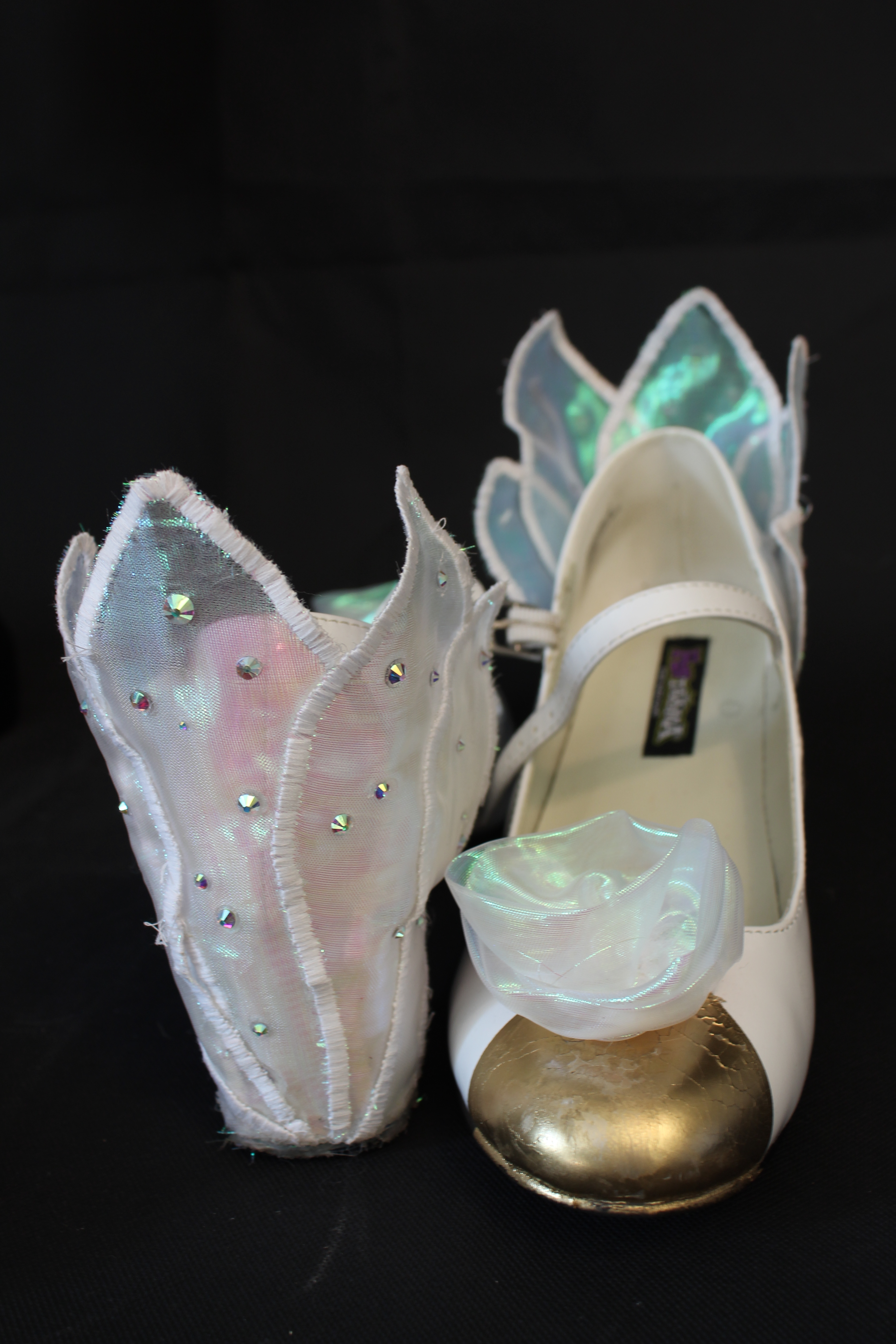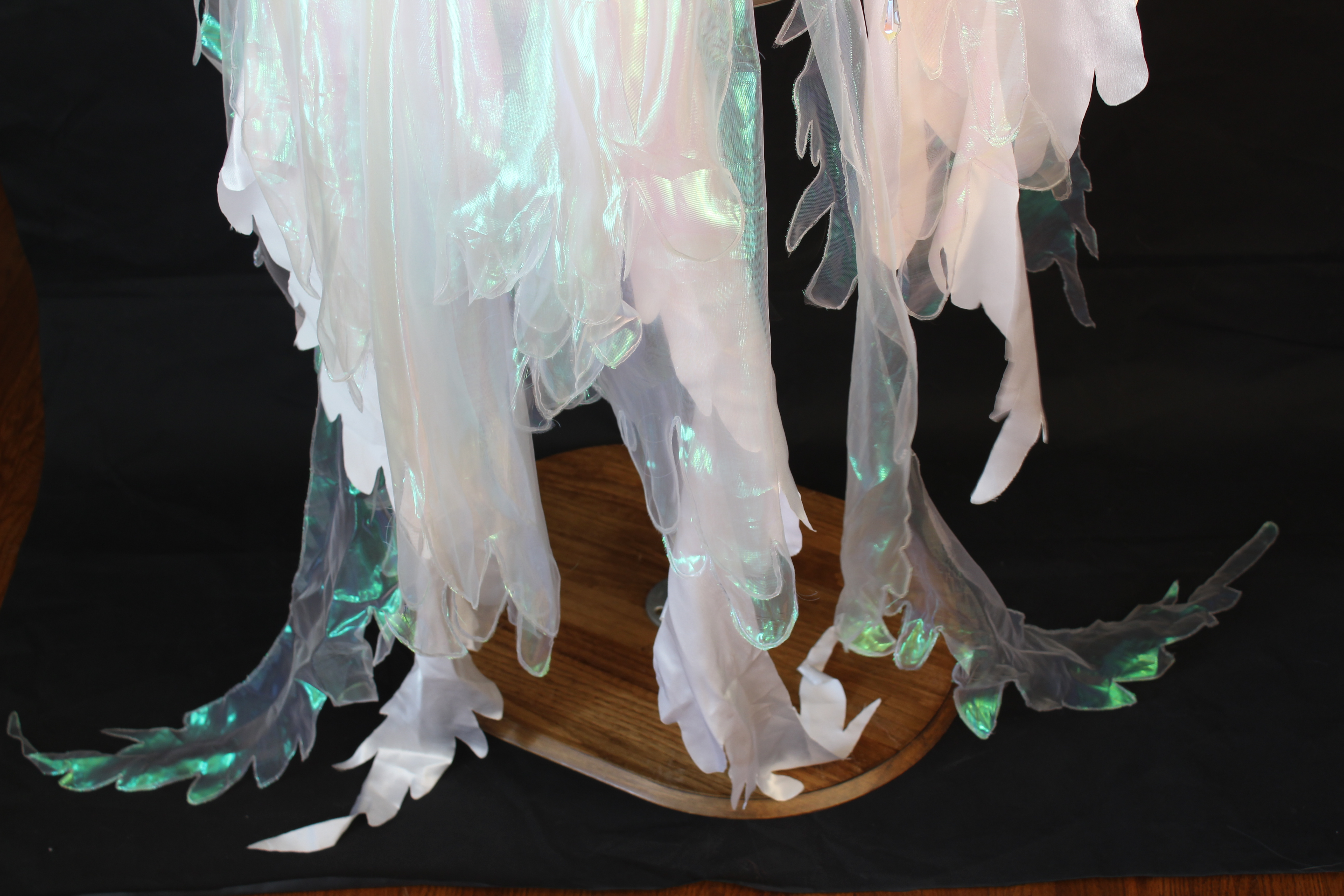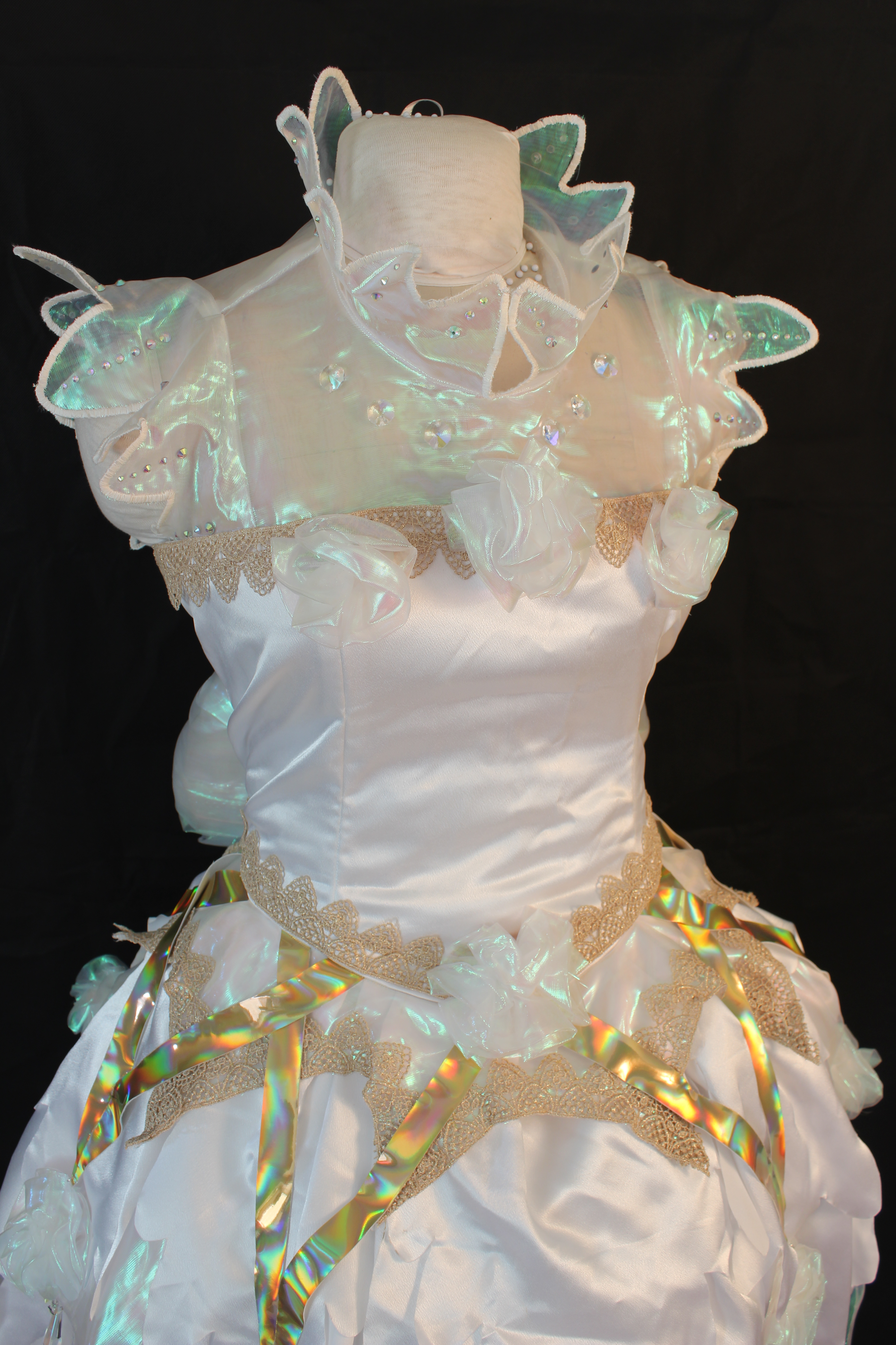 Materials used: wood dowel, wood ends, metal, eva foam, foam clay, satin, organza, vinyl, lace, hotfix rhinestones, crystals, plexiglass.
