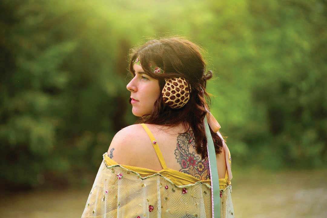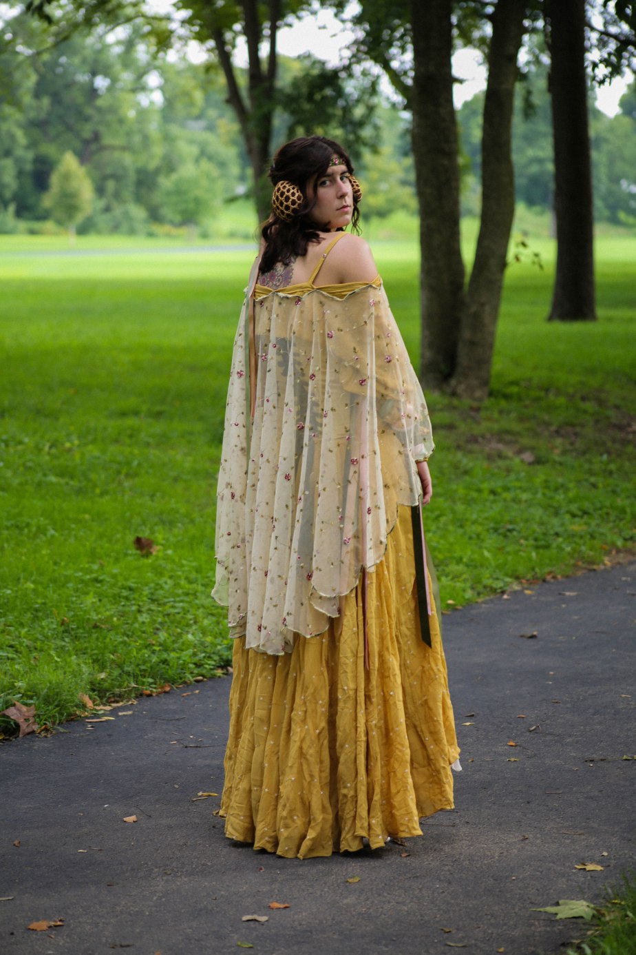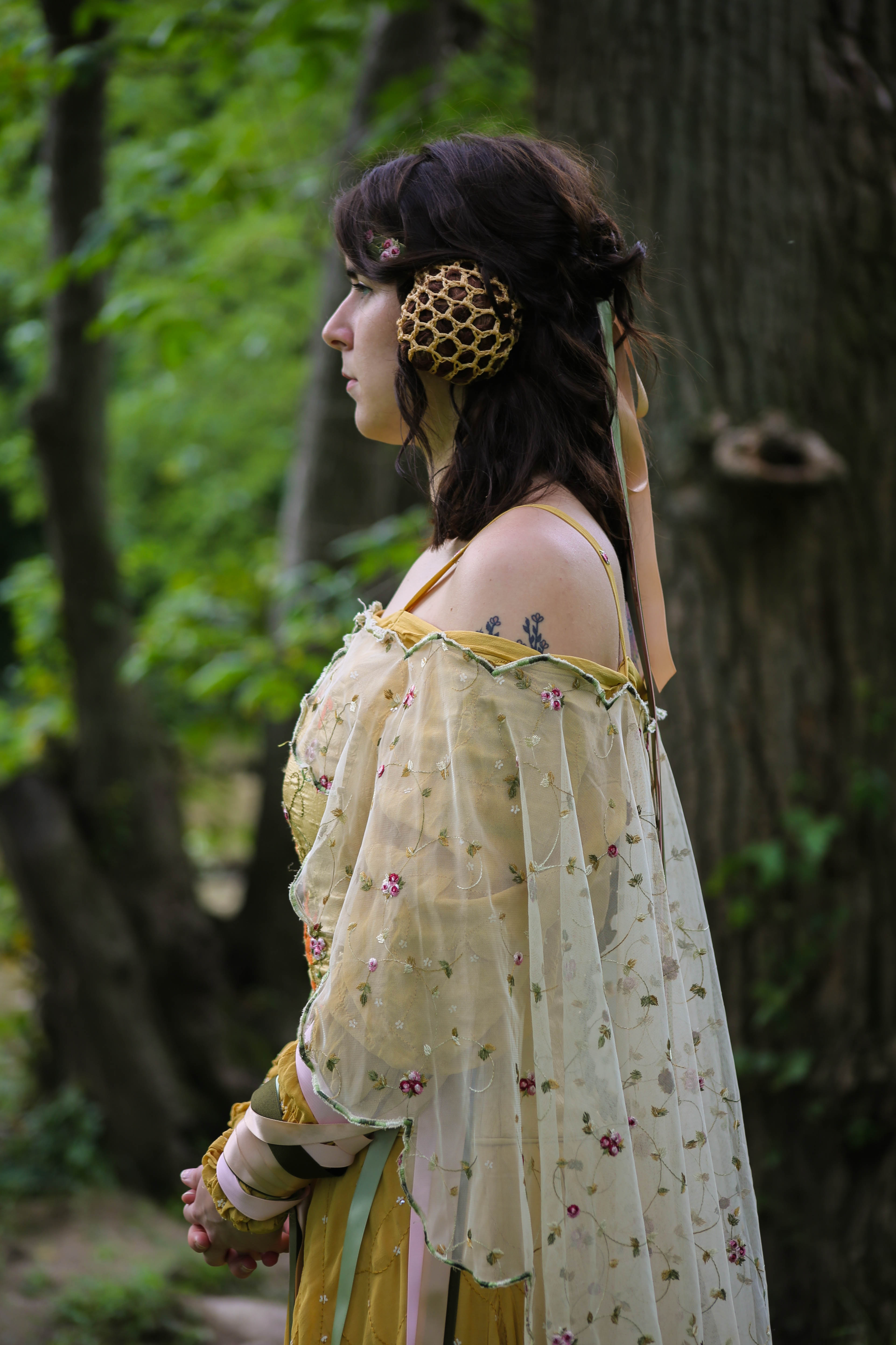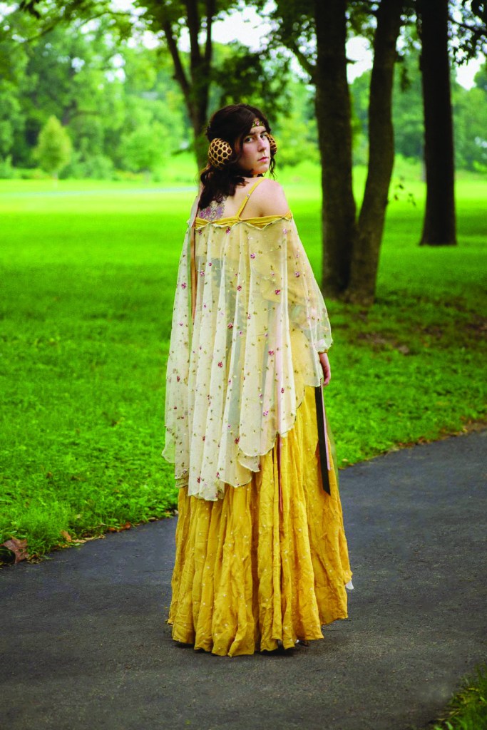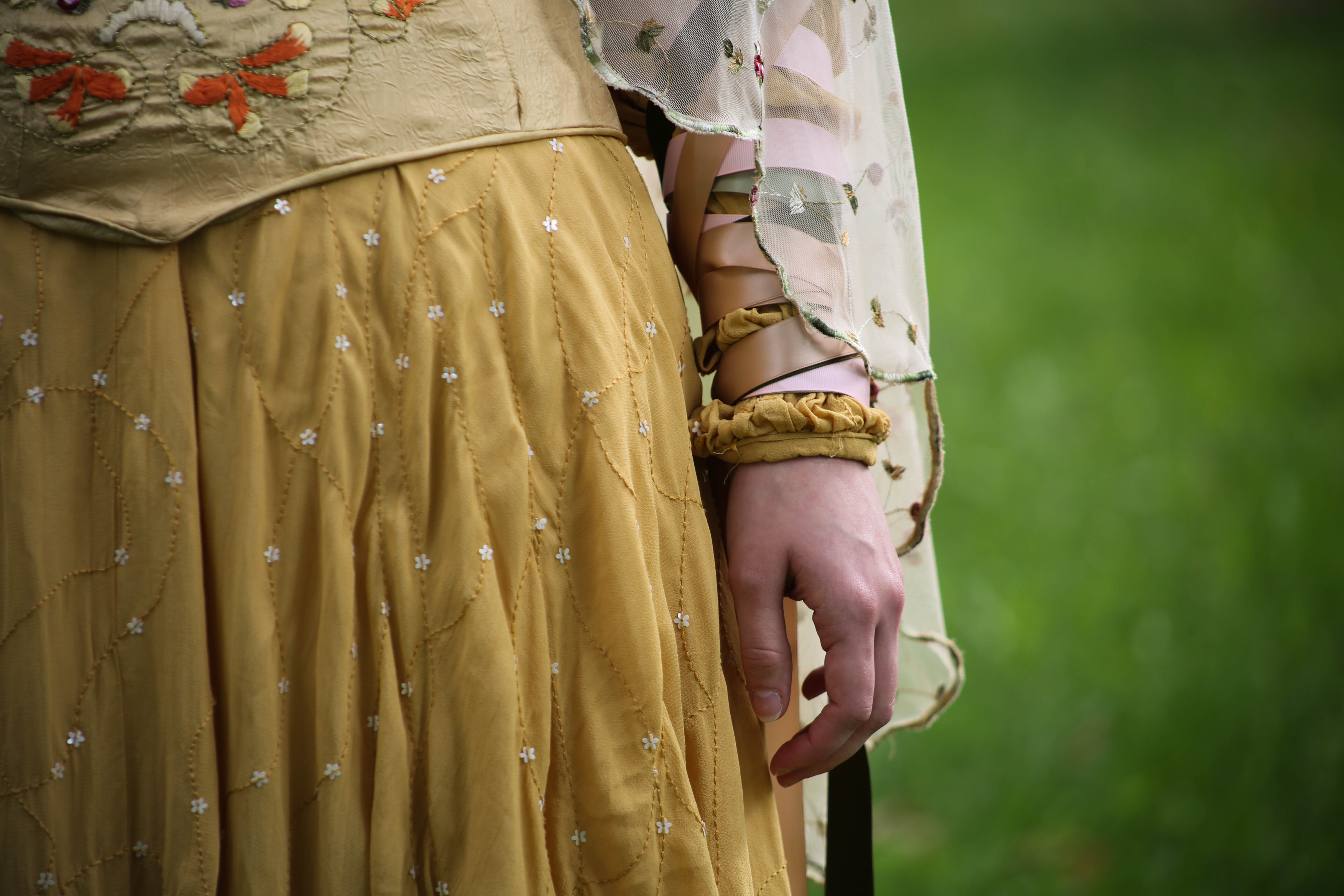 Costume features a densely embroidered corset made of crushed taffeta, satin, and cotton. Rear lacing with nylon boning for structure. Oversize peasant blouse with gathered sleeves, embroidered with swirling lines of yellow thread and white flower sequins. Ribbons attached at the elbow to wrap around the lower arm. Skirt used eight yards of georgette, features four godets and the same embroidery as the blouse. Cape with scalloped edging embroidered in variegated thread and tea dyed is tack stitched to the blouse, front closure completed with an antique brooch. Hairpiece made of velvet ribbon, metallic thread, roses from cape, with purchased snoods attached. Ties in the rear via ribbon.