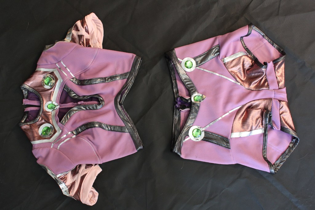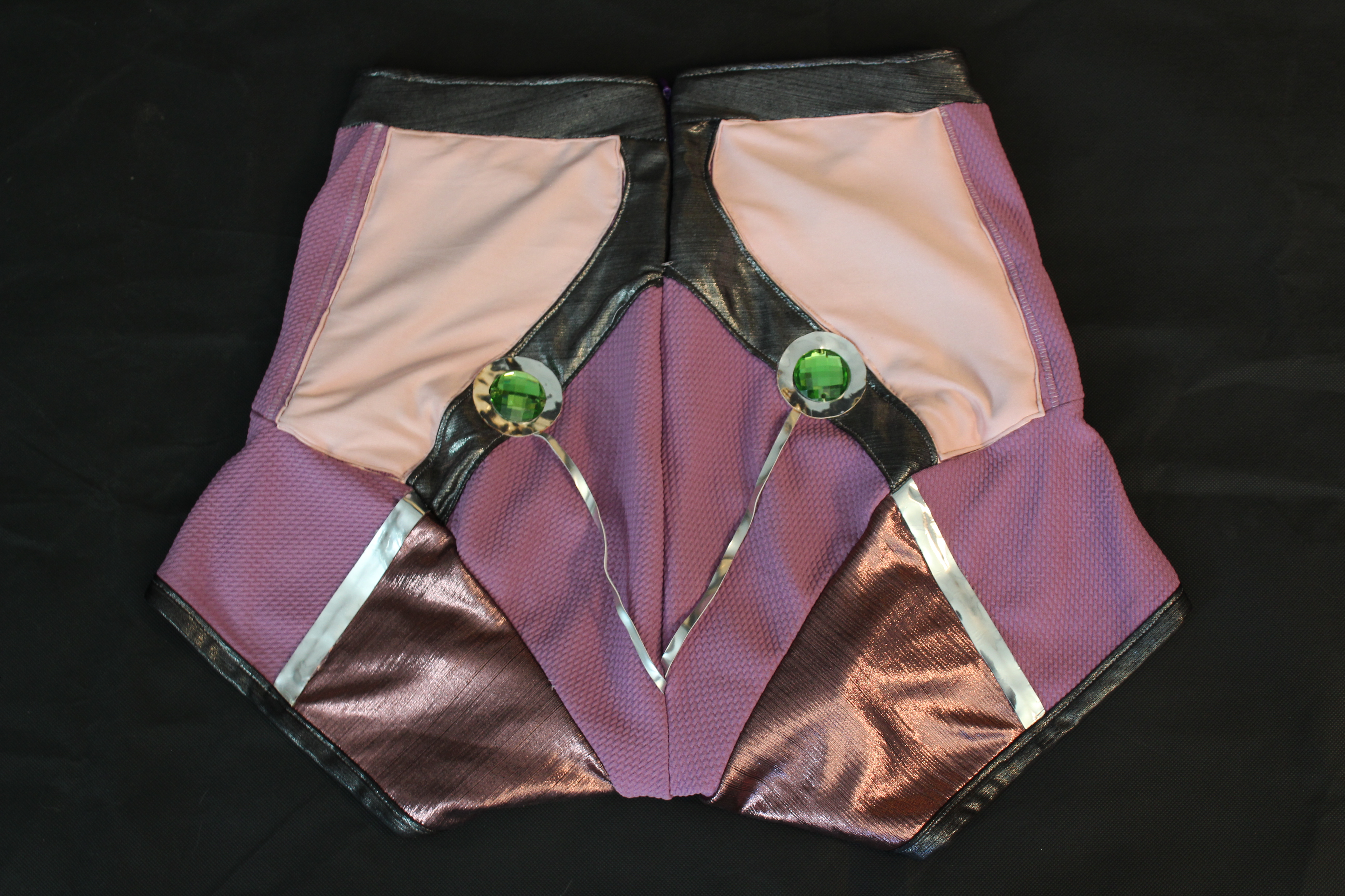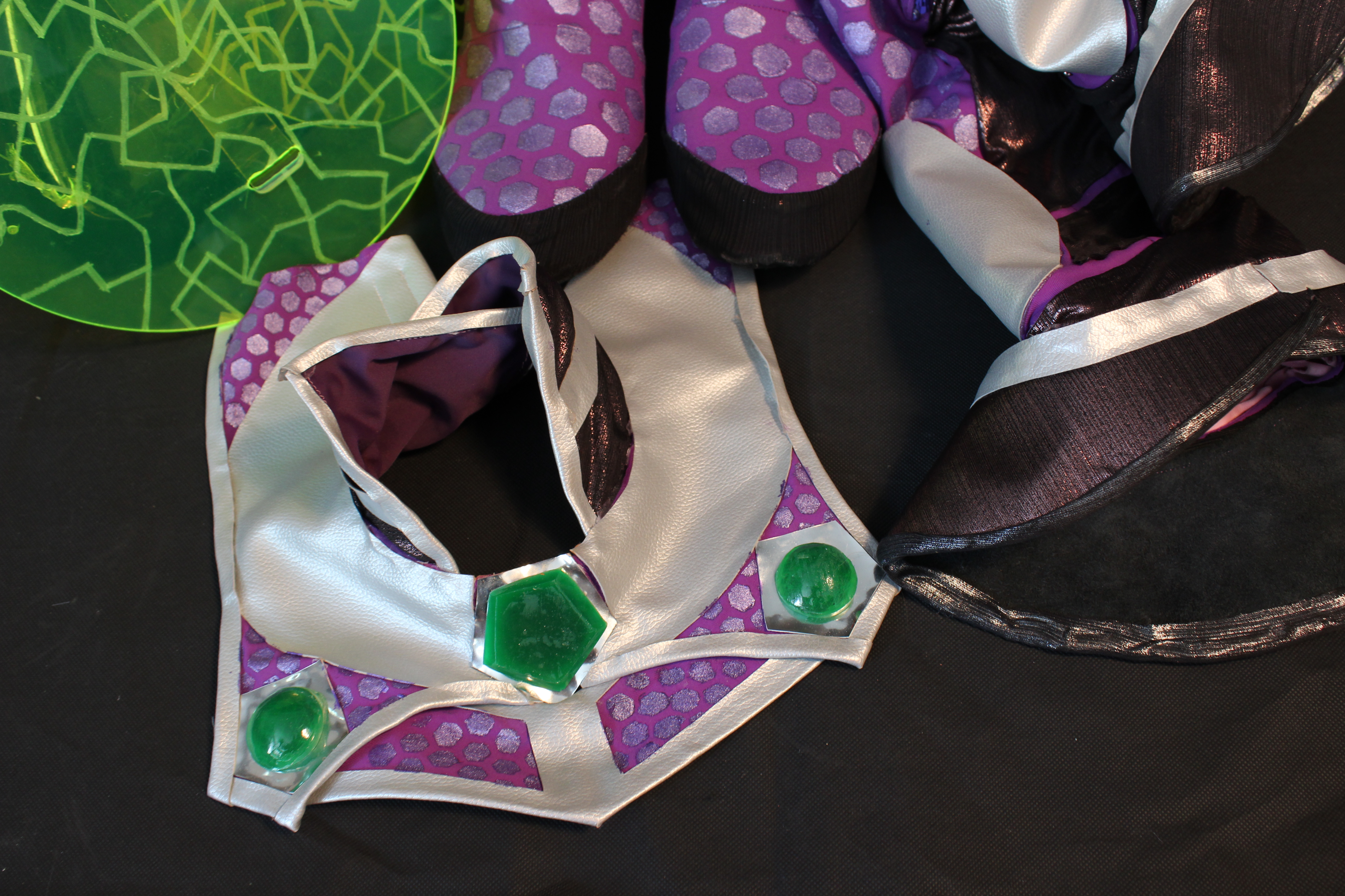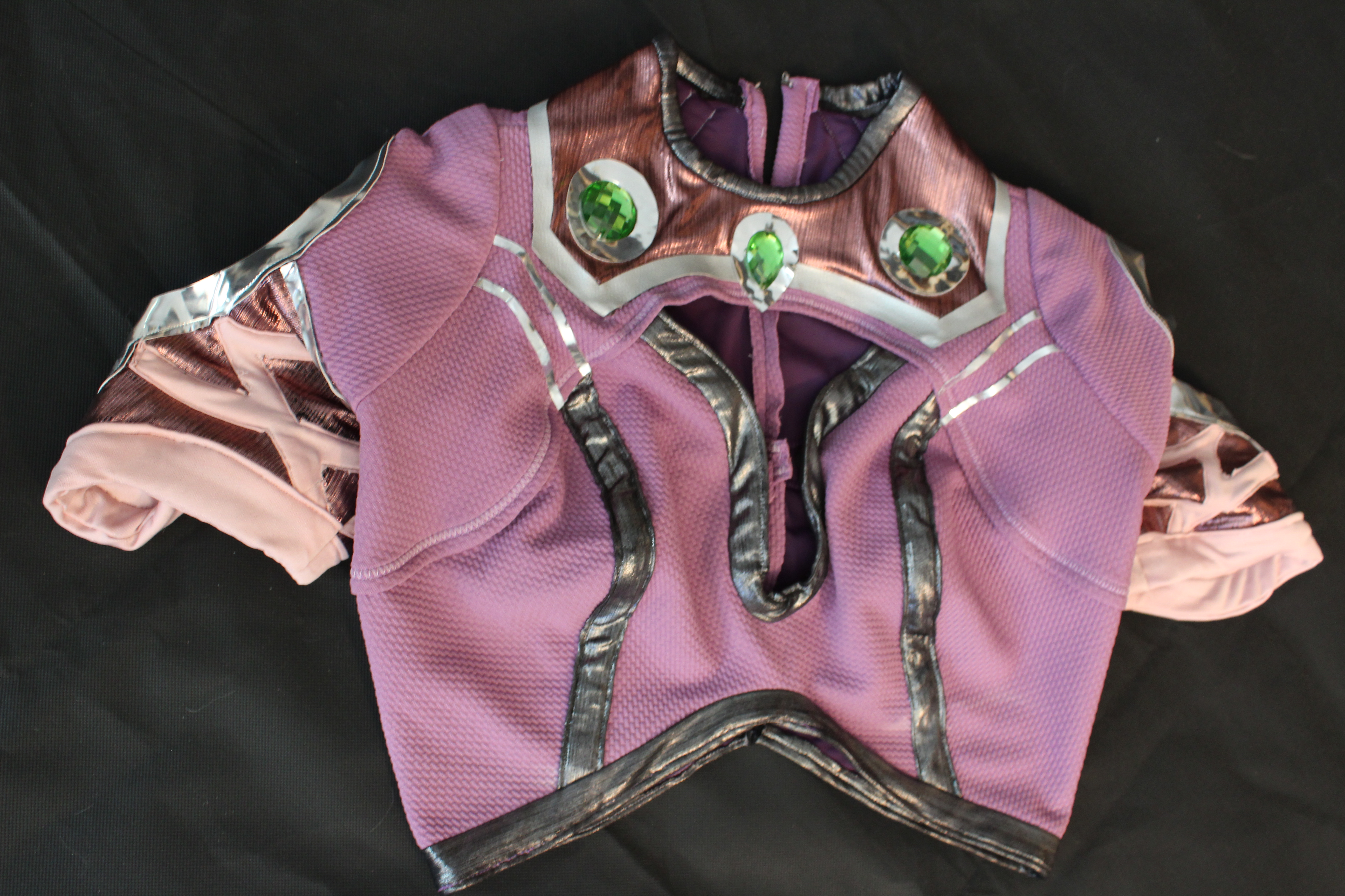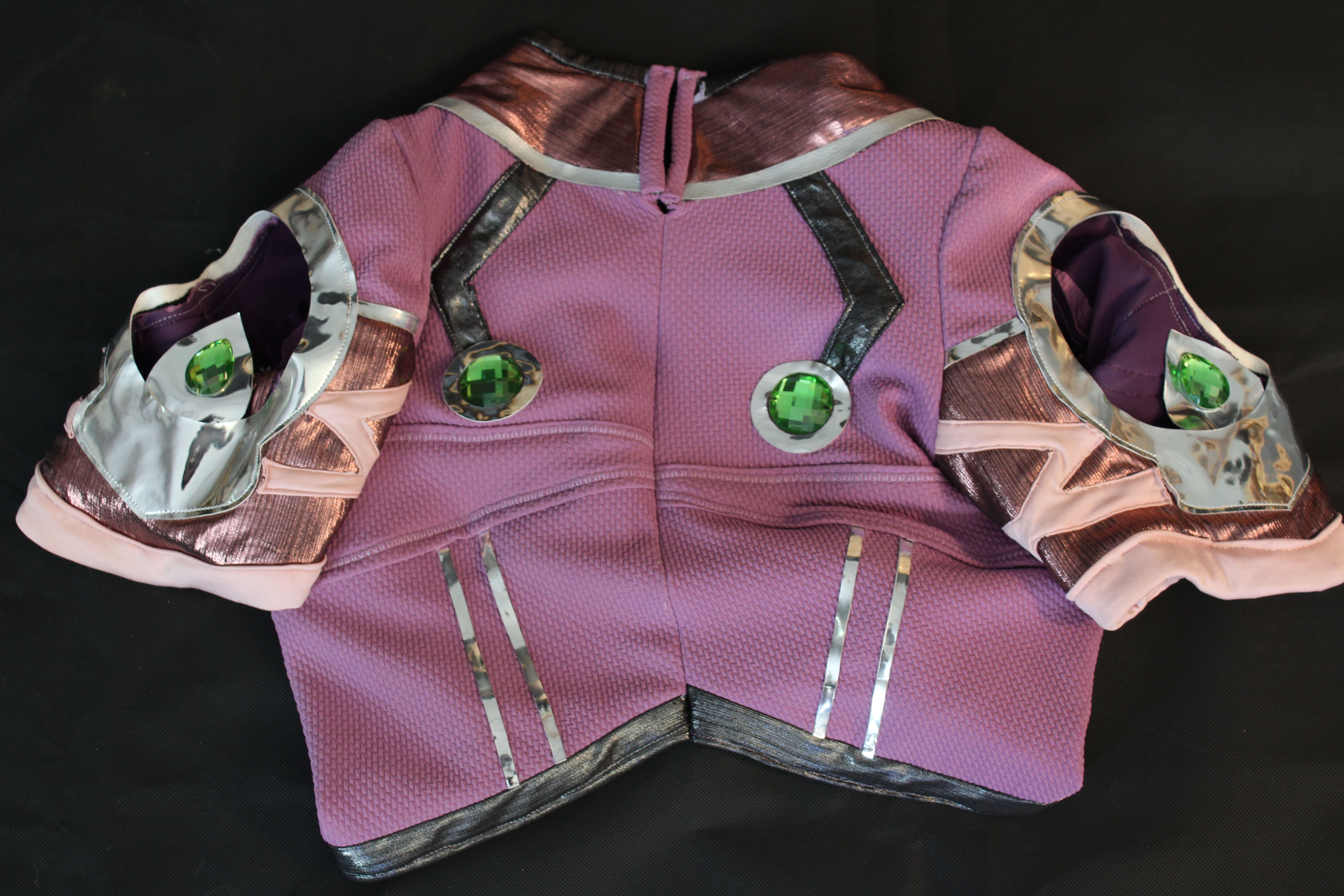 Features a crop top and high waist bottoms. Sleeves have a cutout shoulder with vinyl insert. Open chest with faux collar donned with gems. Elbow length fingerless gloves have eva foam armor covered with lame fabric and faux leather that attach via velcro. Shoe covers are rather simple, like the gloves, and have the addition of eva foam armor.