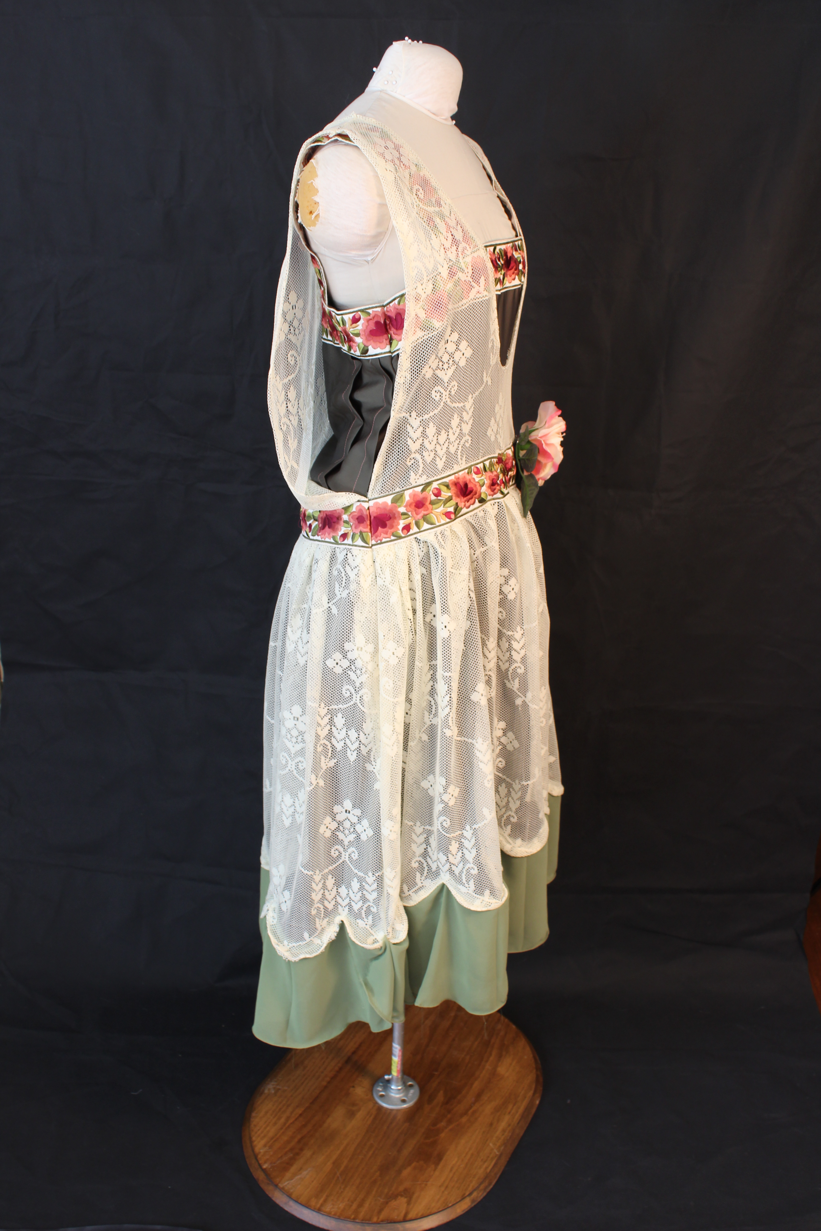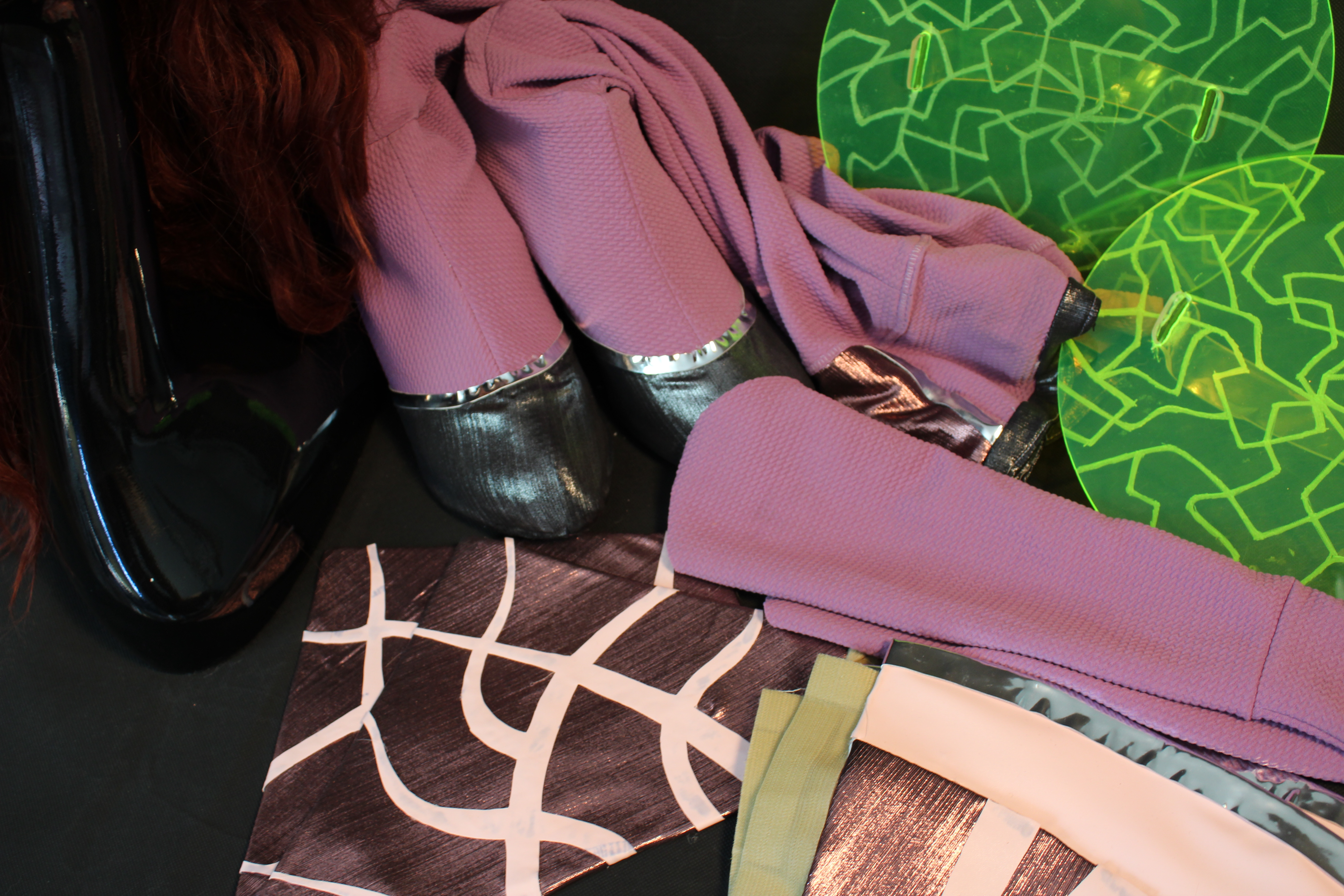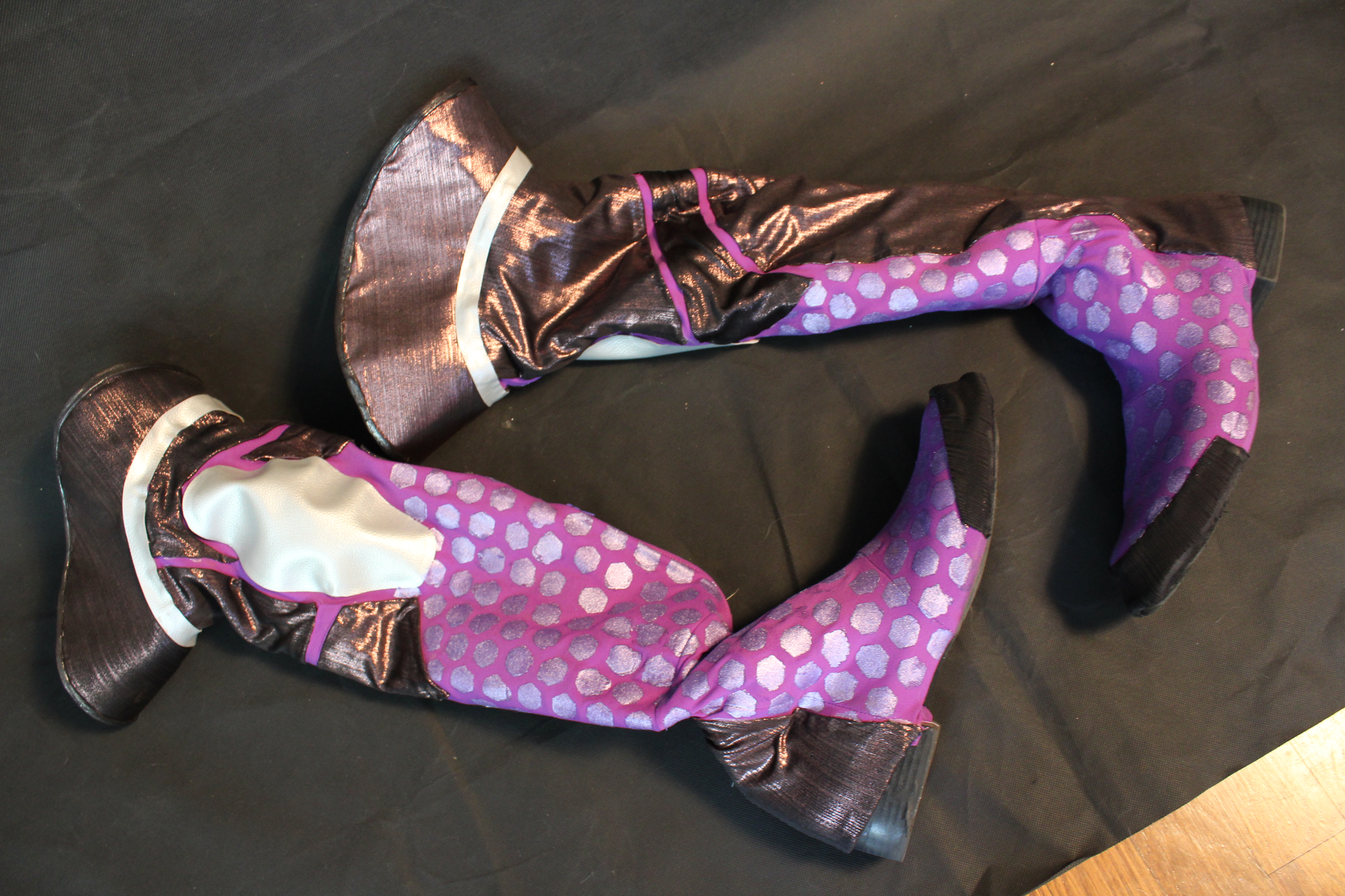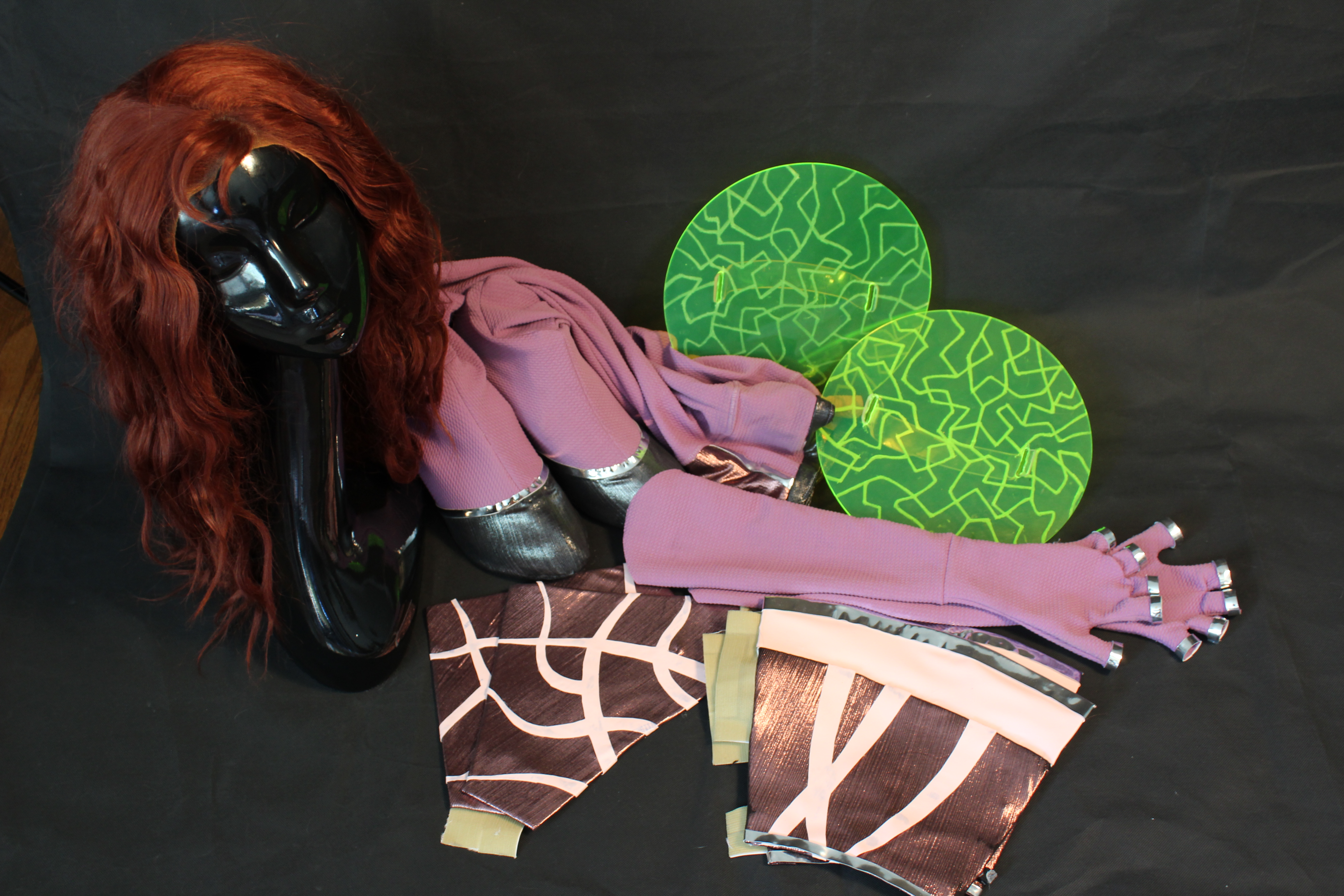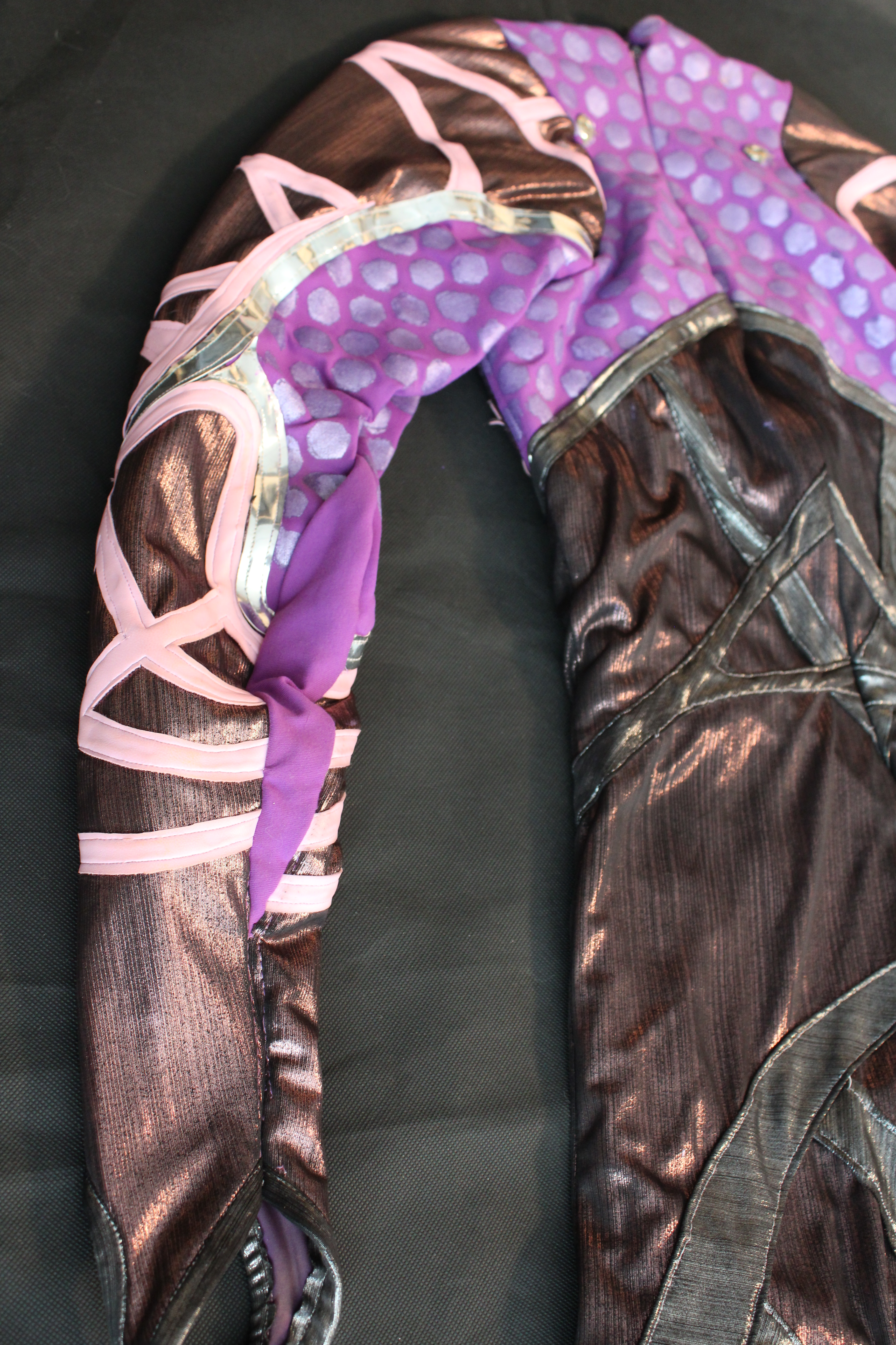 Features a crop top and high waist bottoms. Sleeves have a cutout shoulder with vinyl insert. Open chest with faux collar donned with gems. Elbow length fingerless gloves have eva foam armor covered with lame fabric and faux leather that attach via velcro. Shoe covers are rather simple, like the gloves, and have the addition of eva foam armor.