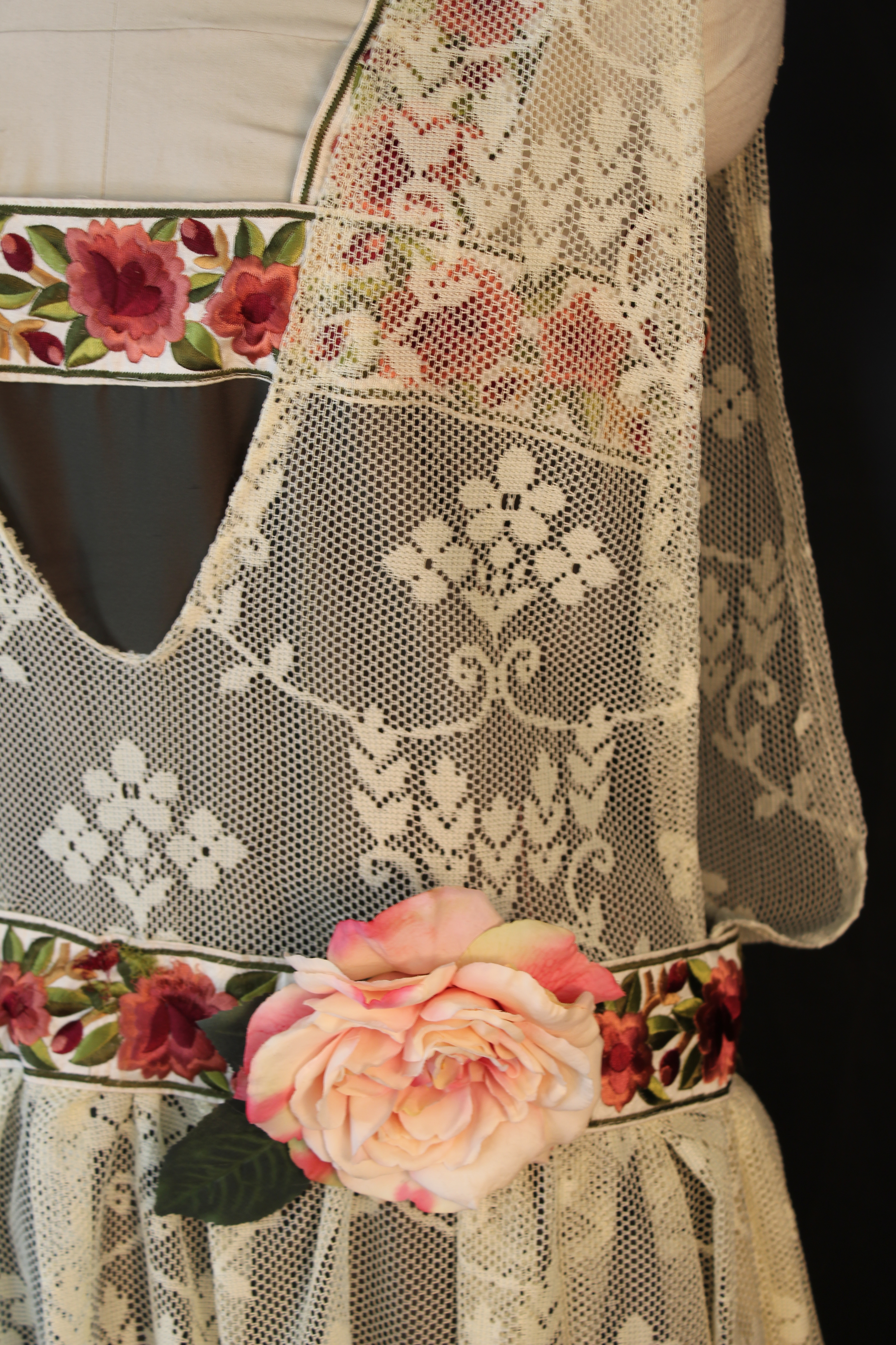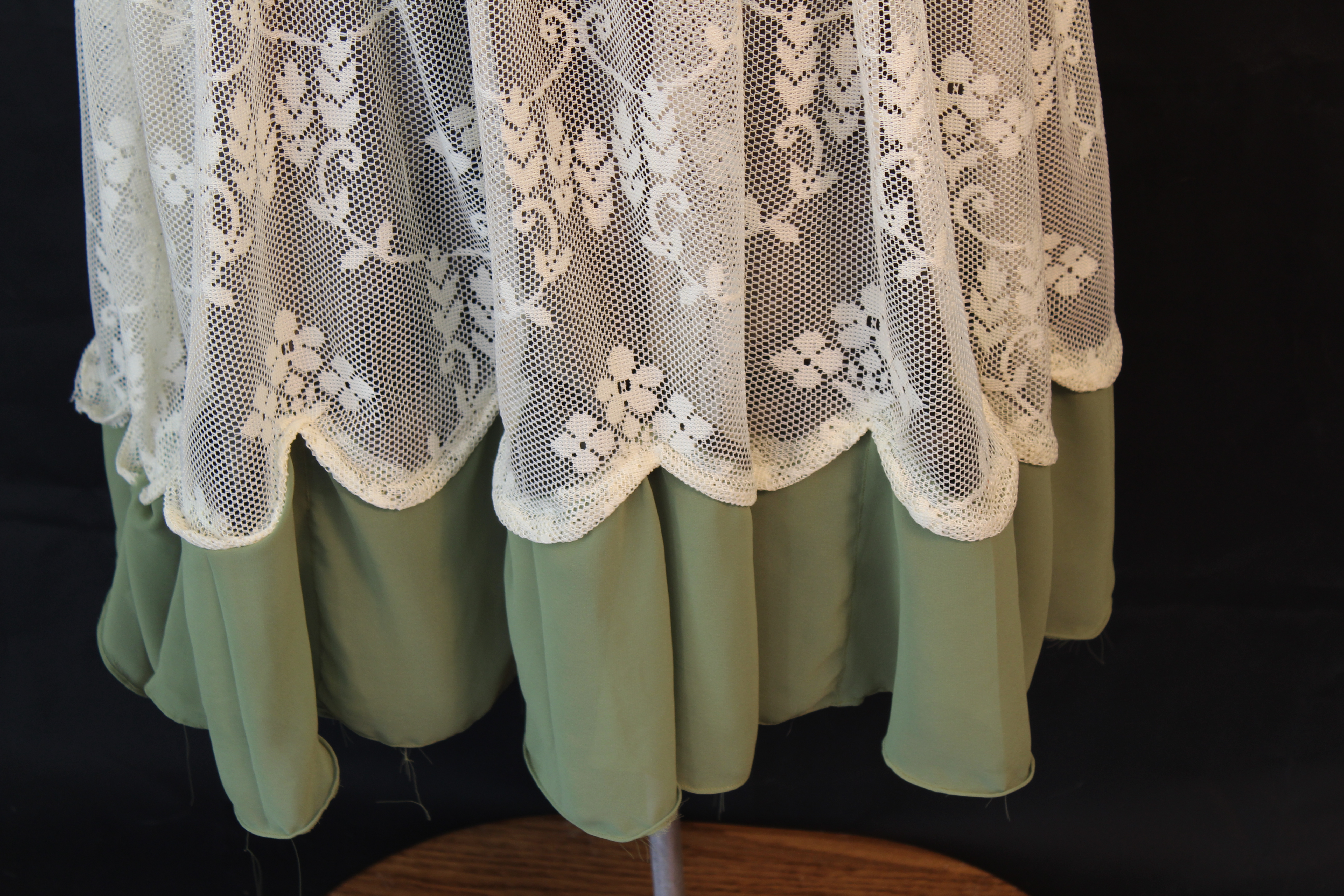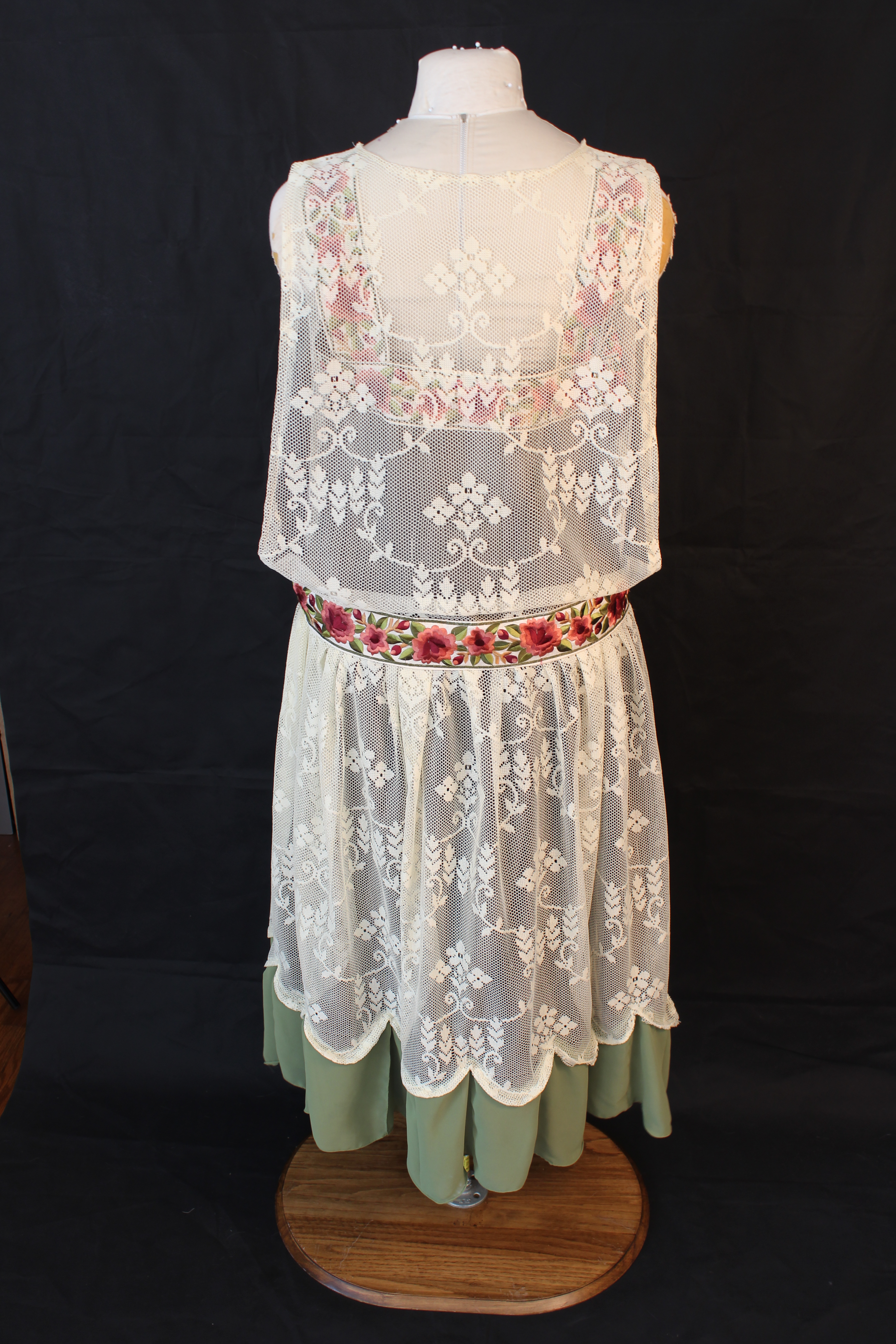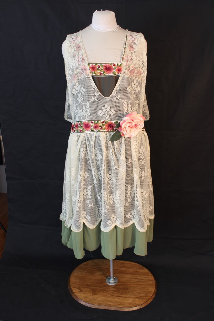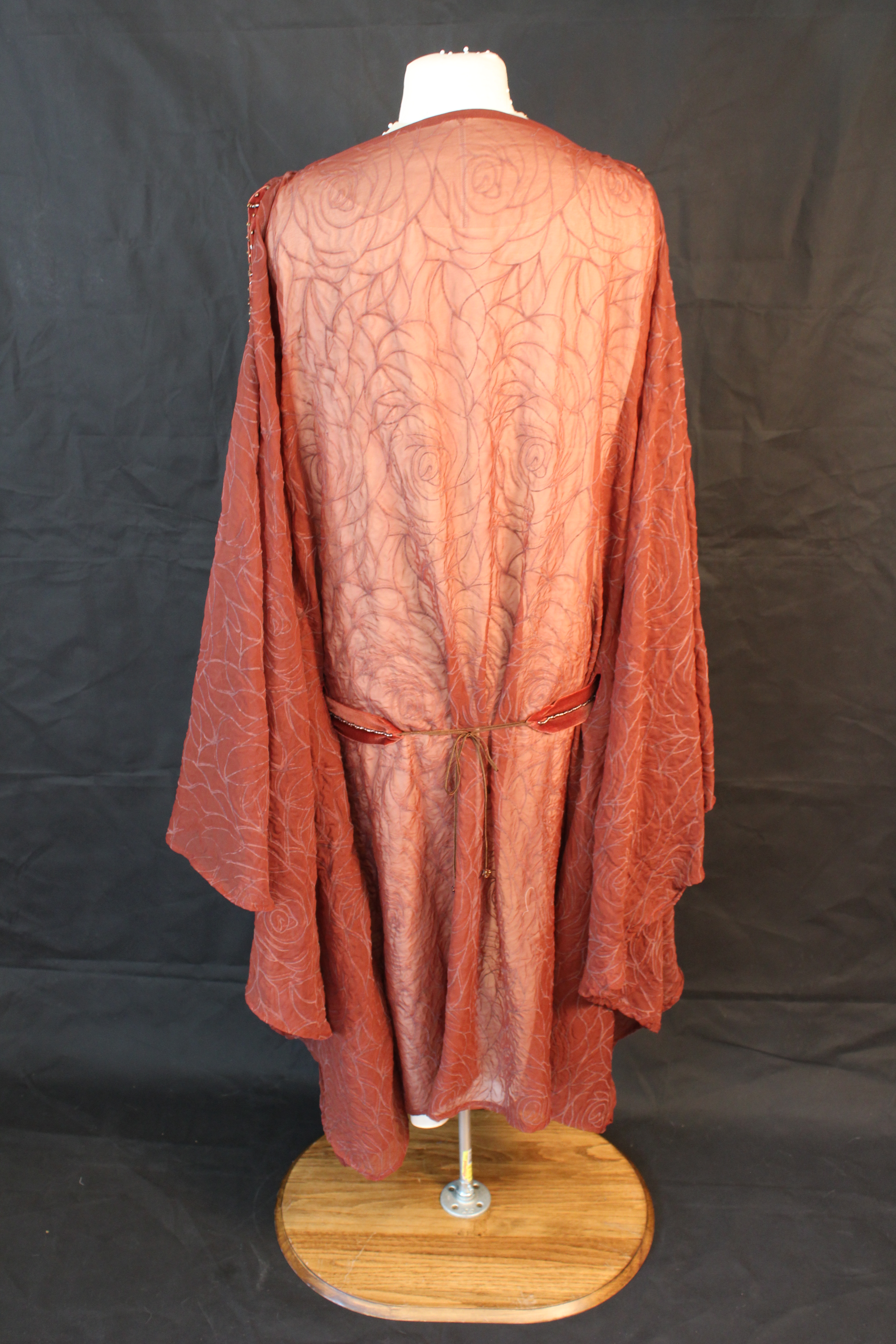 Features a crop top and high waist bottoms. Sleeves have a cutout shoulder with vinyl insert. Open chest with faux collar donned with gems. Elbow length fingerless gloves have eva foam armor covered with lame fabric and faux leather that attach via velcro. Shoe covers are rather simple, like the gloves, and have the addition of eva foam armor.
