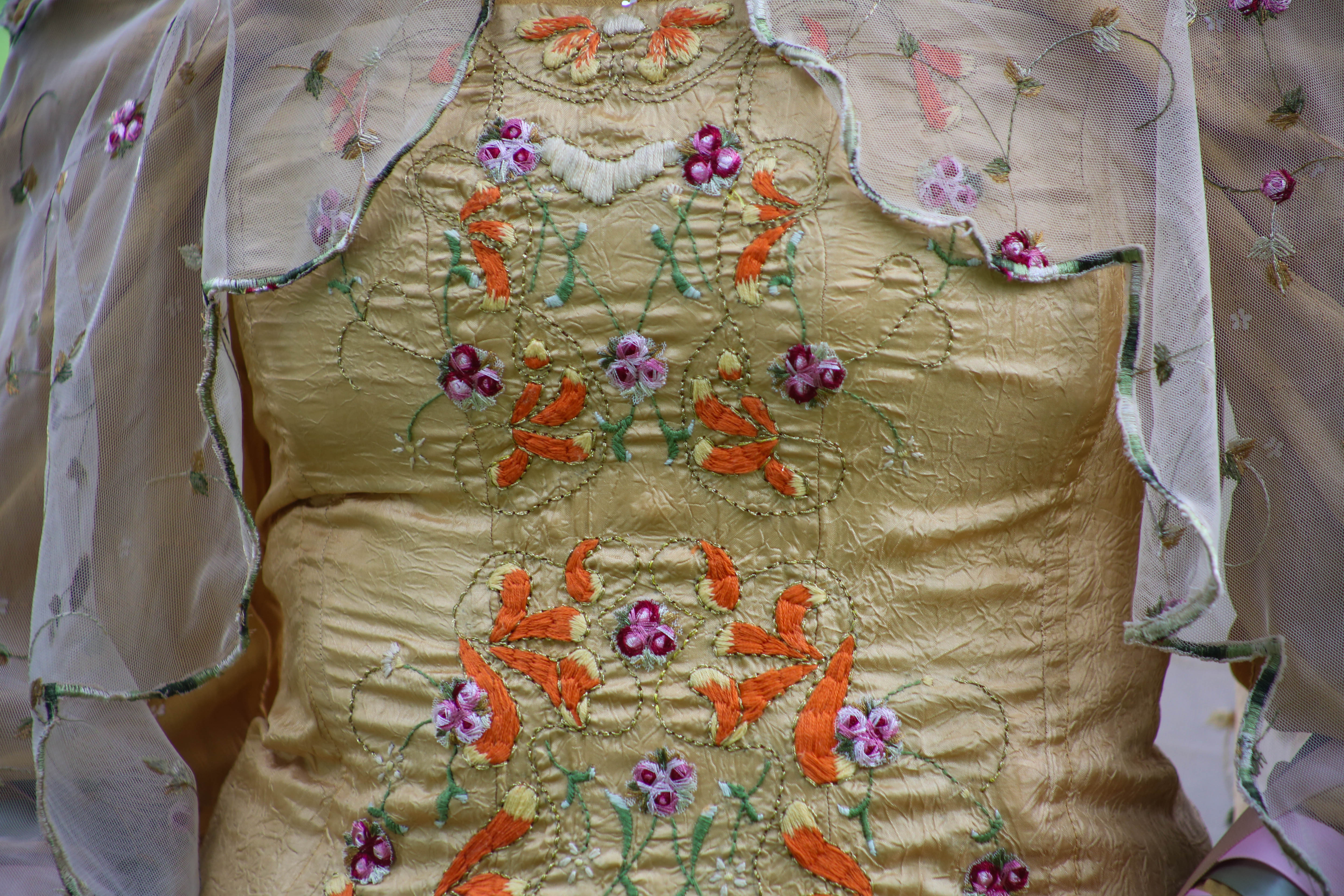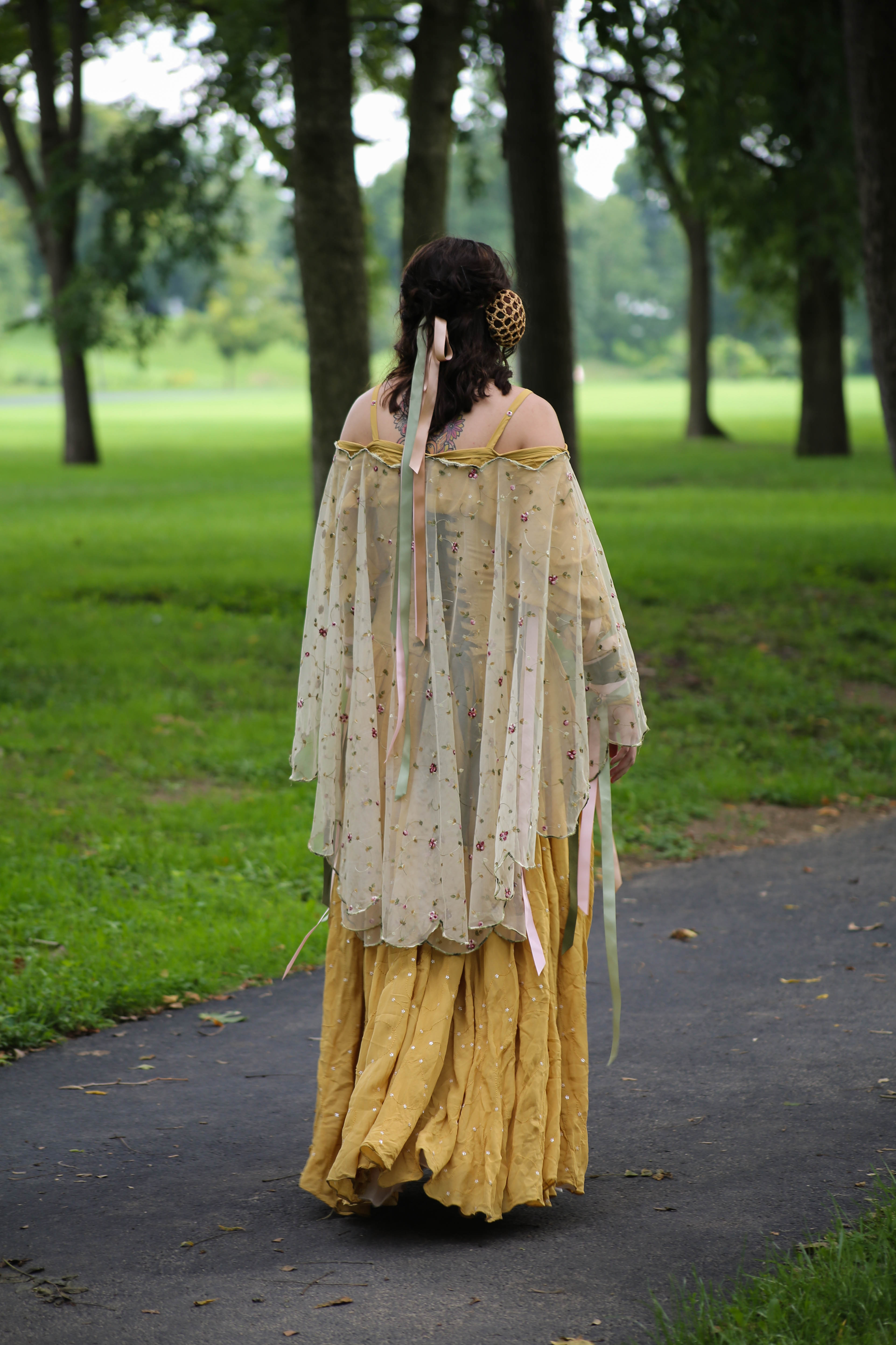 Costume features a densely embroidered corset made of crushed taffeta, satin, and cotton. Rear lacing with nylon boning for structure. Oversize peasant blouse with gathered sleeves, embroidered with swirling lines of yellow thread and white flower sequins. Ribbons attached at the elbow to wrap around the lower arm. Skirt used eight yards of georgette, features four godets and the same embroidery as the blouse. Cape with scalloped edging embroidered in variegated thread and tea dyed is tack stitched to the blouse, front closure completed with an antique brooch. Hairpiece made of velvet ribbon, metallic thread, roses from cape, with purchased snoods attached. Ties in the rear via ribbon.